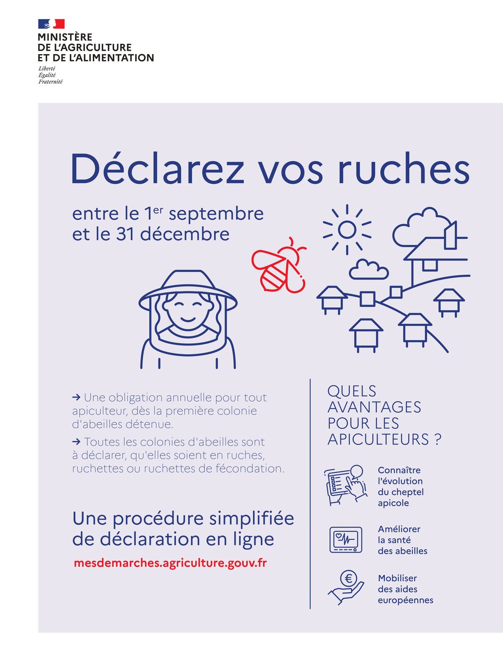 Tout propriétaire ou détenteur de colonies d'abeilles - dès la 1e ruche - a l'obligation de procéder à une déclaration de détention et d'emplacement de ruches pendant la campagne annuelle qui a lieu entre le 1er septembre et le 31 décembre.