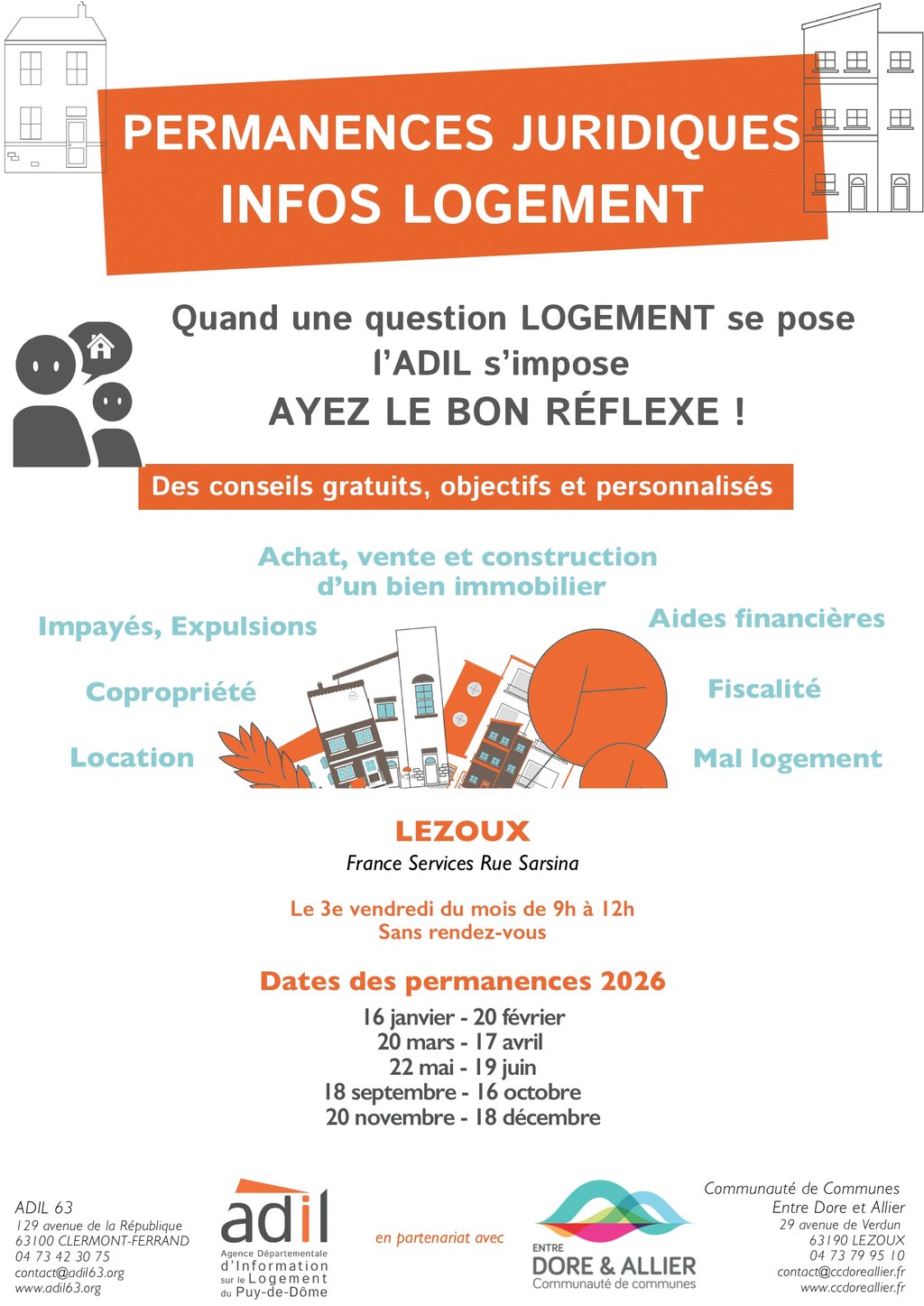 Permanences juridiques infos logement de l'ADIL dans les bureaux de France Services à Lezoux