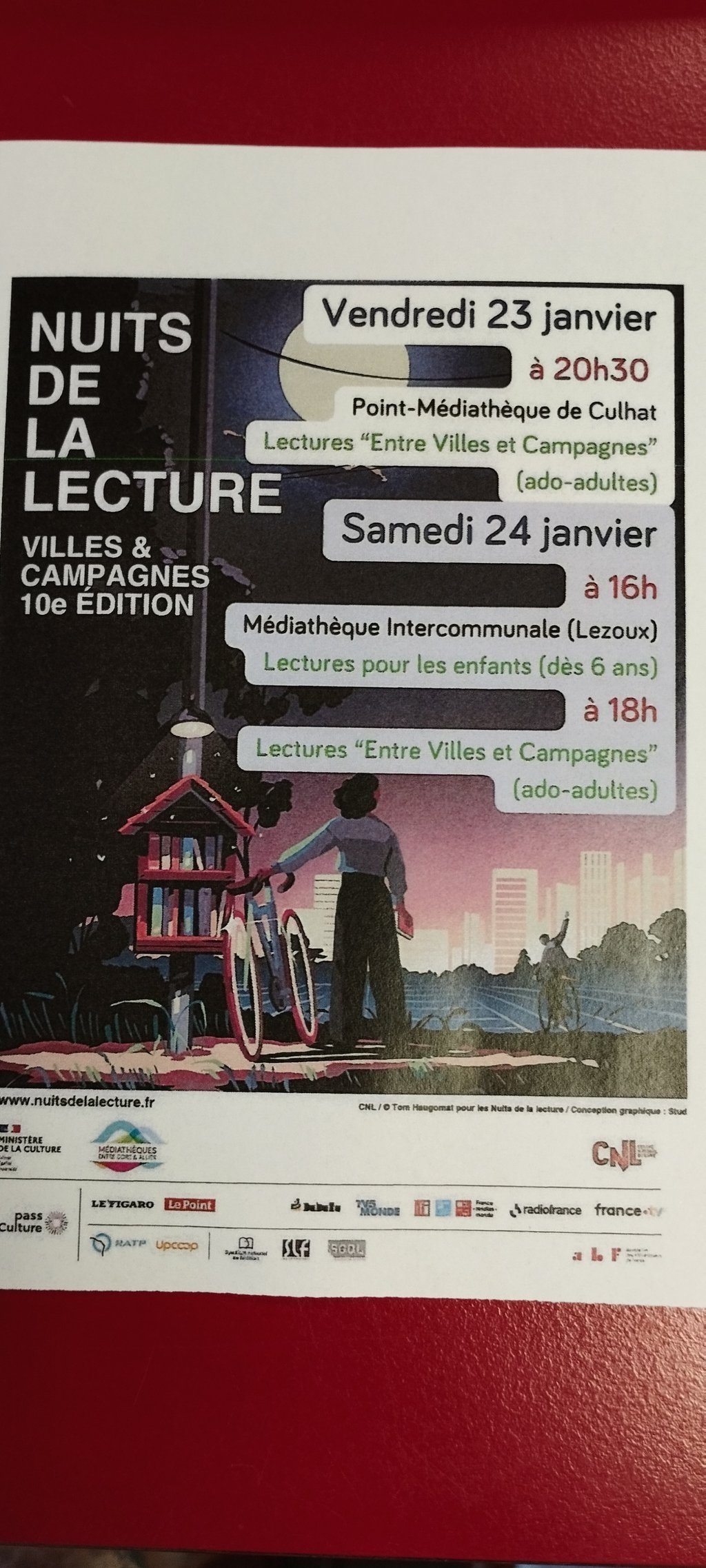 Vendredi 23 janvier à 20 h 30 au point médiathèque de Culhat : Lectures " Entre Villes et Campagnes" pour ados et adultes