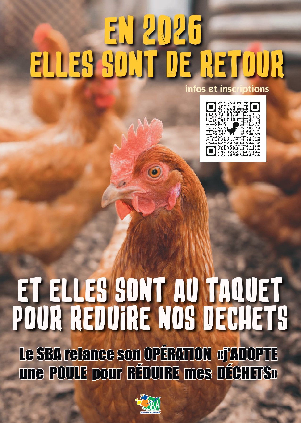 Depuis plus de 7 ans, le SBA propose à ses usagers l’opération « J’adopte une poule pour réduire mes déchets ». L’adoption de gallinacés est une solution originale pour valoriser ses déchets organiques puisqu’une poule permet de diminuer de 20 à 30% la quantité de déchets jetés à la poubelle !